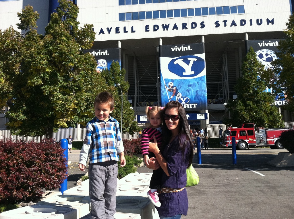 We went to our first BYU game as a family last Saturday. We figured we'd last till about halftime, which is when we did! Luke and Halle loved doing the cougar fight song and cheering. Luke kept his attention a lot longer than Halle, I ended up having to resort to using the phone for entertainment for her.