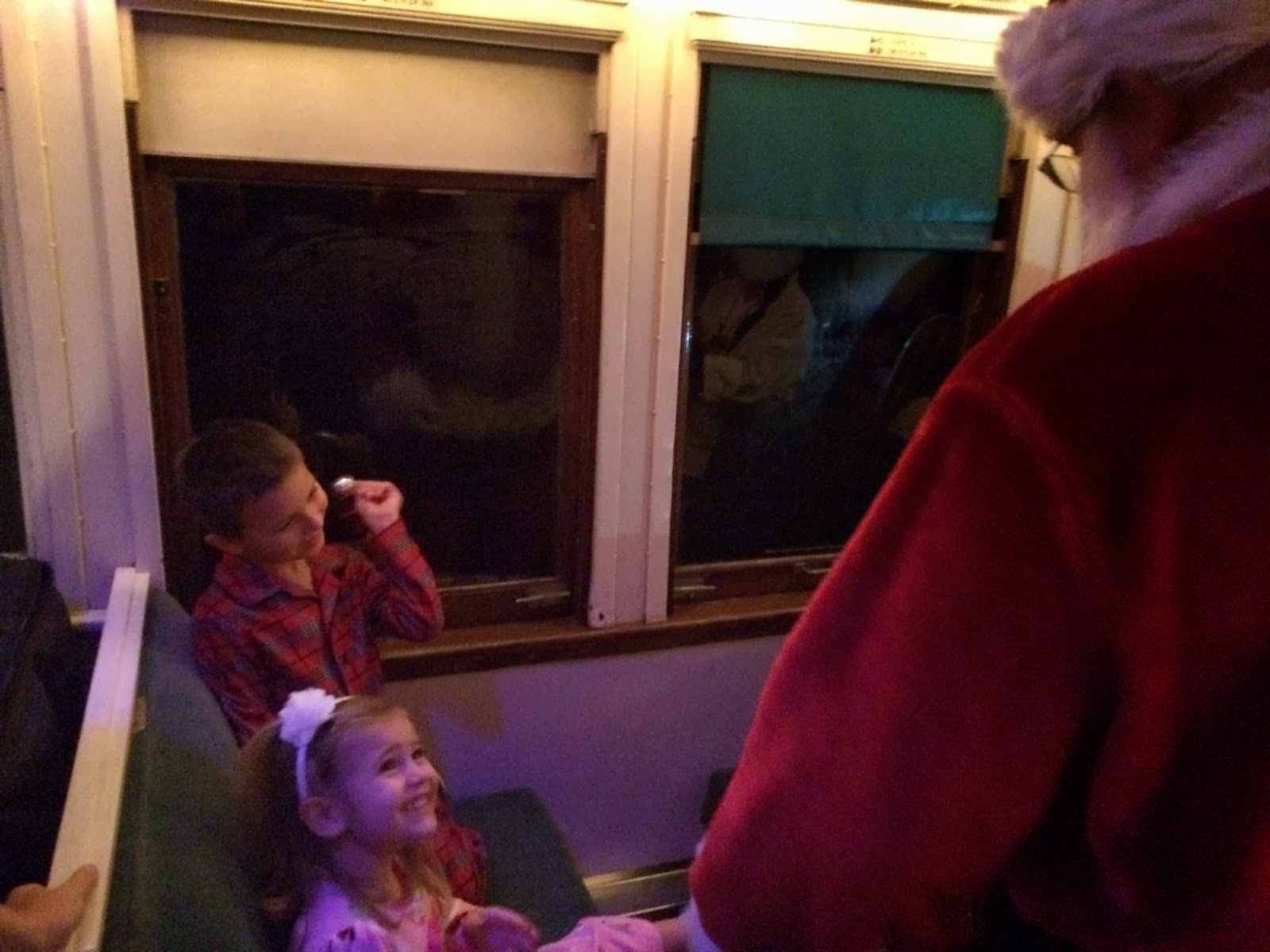 Over Thanksgiving weekend we went on a trip to the Polar Express! We drove five hours there and then boarded the train. Then we drank hot chocolate, ate cookies, they read us the Polar Express, and then we got to the North Pole! We drove past the lights and then Santa got on board and passed out bells to all the kids on the train. On the way back we sang Christmas carols. The kids loved it! It was very fun.