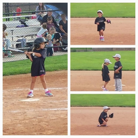 This was Halle's first year playing and she started out a little timid hitting the ball but by the end she was hitting it hard and far every time. In the outfield she did good catching and throwing the ball and sometimes had more fun sitting in the dirt and scooping dirt into her mit and pouring it into her hat and on her head, which was funny and cute to watch. One game she volunteered to be the catcher and had that big heavy outfit on and after one catch started taking all the gear off and dropping it to the ground right there in the field - she was done! It was pretty funny.